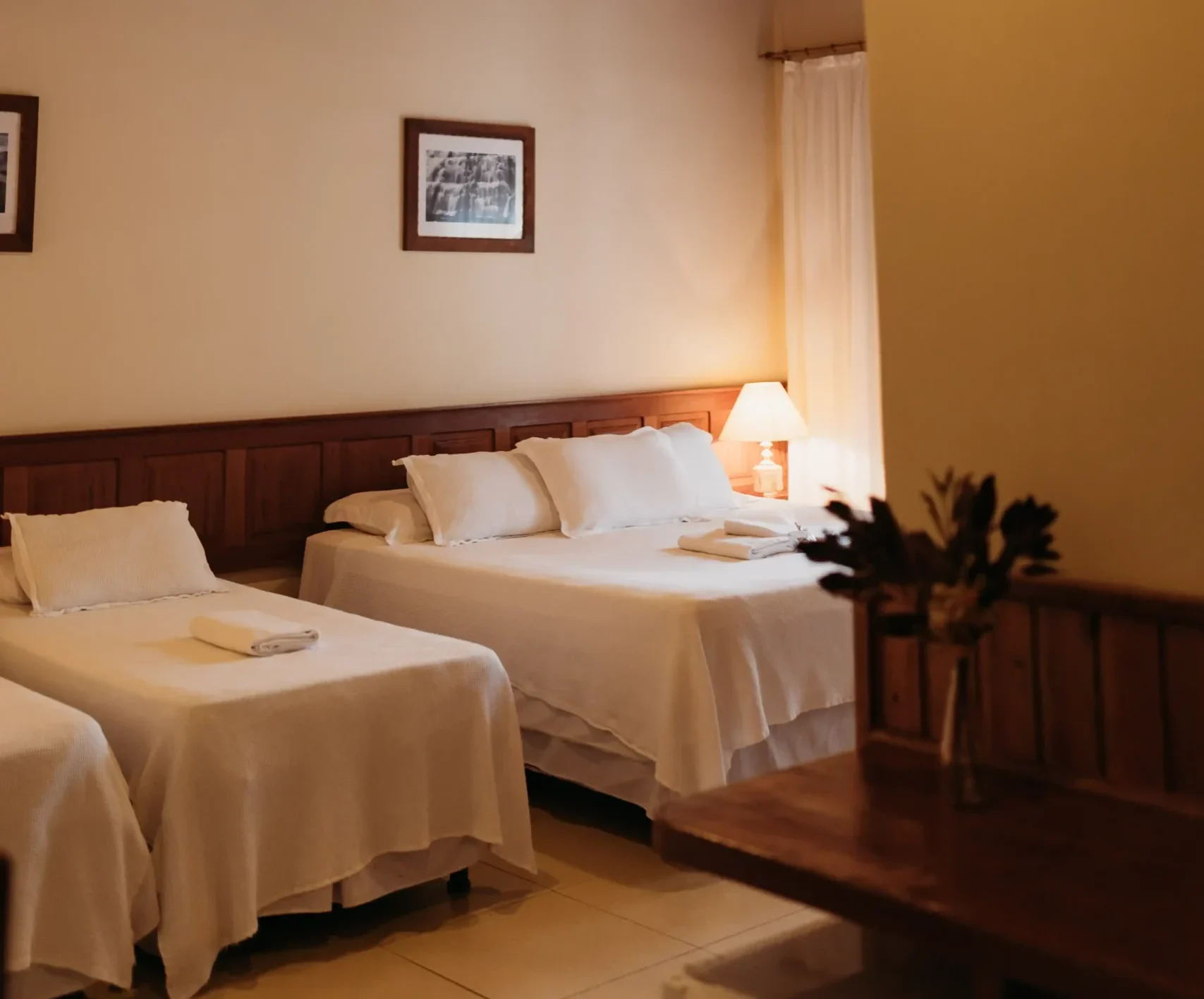 Quarto Aconchegante e Funcional conta com 20m², este quarto possui detalhes em madeira e varanda, oferecendo uma cama casal padrão ou uma cama casal padrão e uma cama de solteiro. Equipado com TV a cabo, frigobar, ar-condicionado, secador de cabelos, telefone, Wifi e ambiente Pet Friendly, garantindo conforto e praticidade para sua estadia.